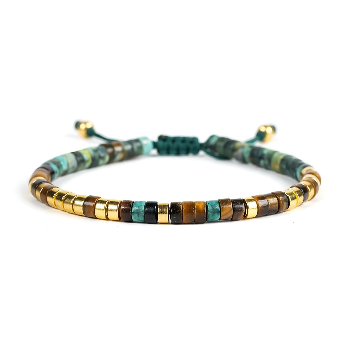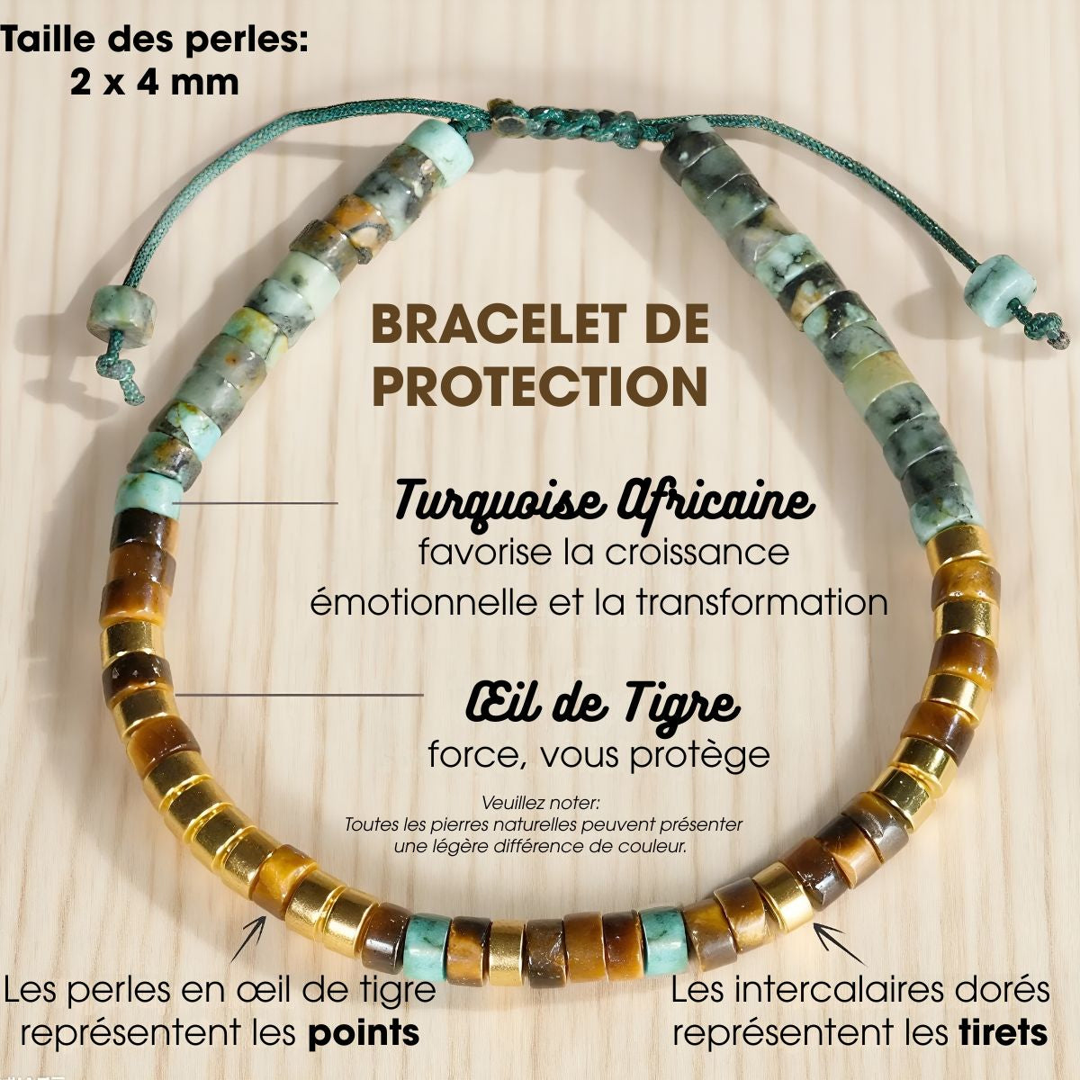✔ Pierres naturelles puissantes – Turquoise Africaine (protection & transformation) et Œil de Tigre (courage & concentration) pour t’accompagner chaque jour.